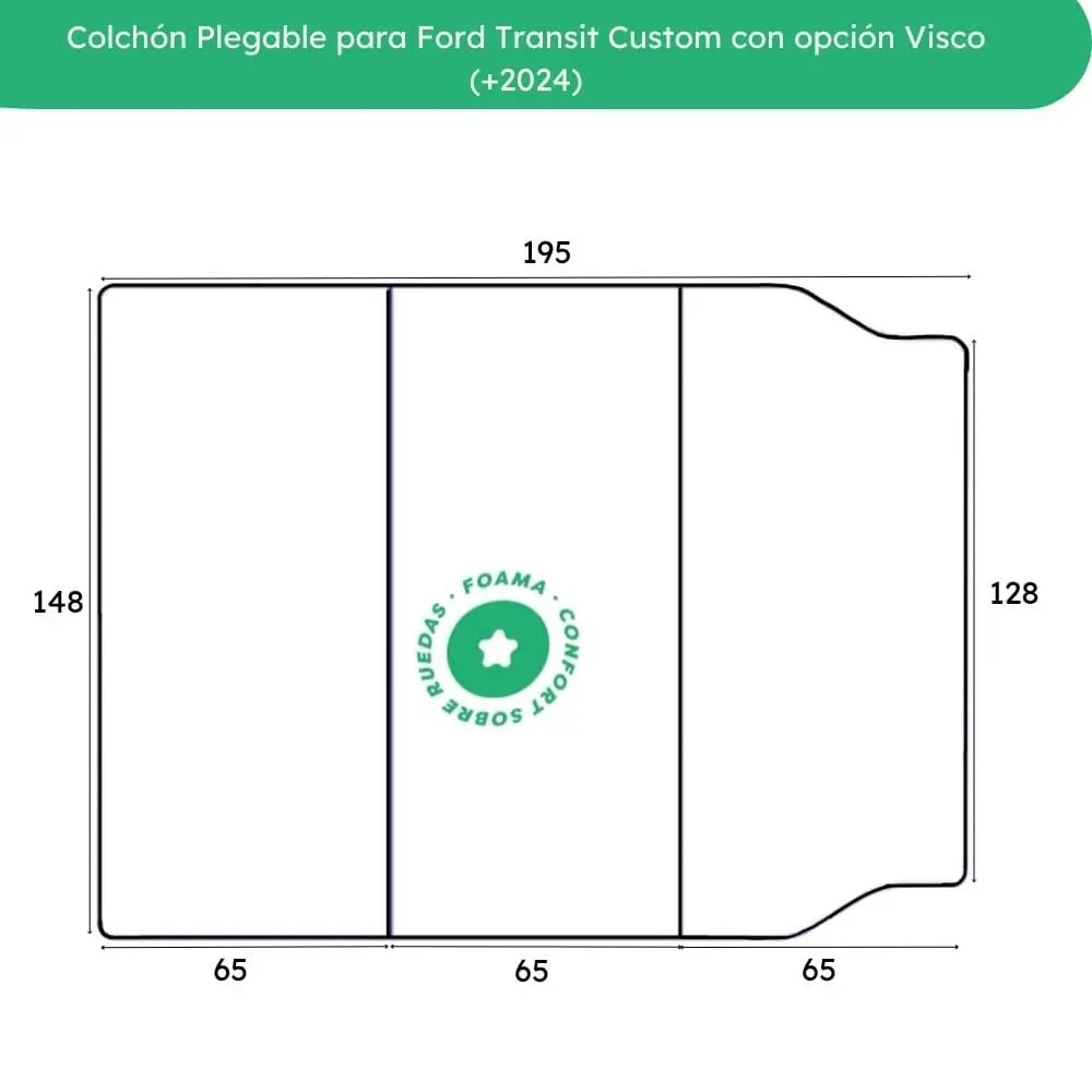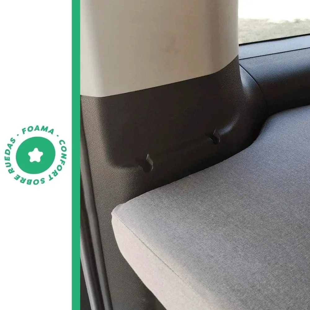 Colchón camper adaptado a Ford Transit Custom. Opciones: espuma firme o espuma + viscoelástica para mayor confort. Diseño plegable para almacenar fácilmente. Funda lavable y materiales duraderos.
